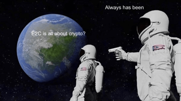 That came out of endless text chatter between me and my much more meme-savvy collaborator Danny Spitzberg. Just a reflection of the strangeness of how much E2C has become associated with crypto. I imagine it makes no sense to most people, but for us it felt just about right.