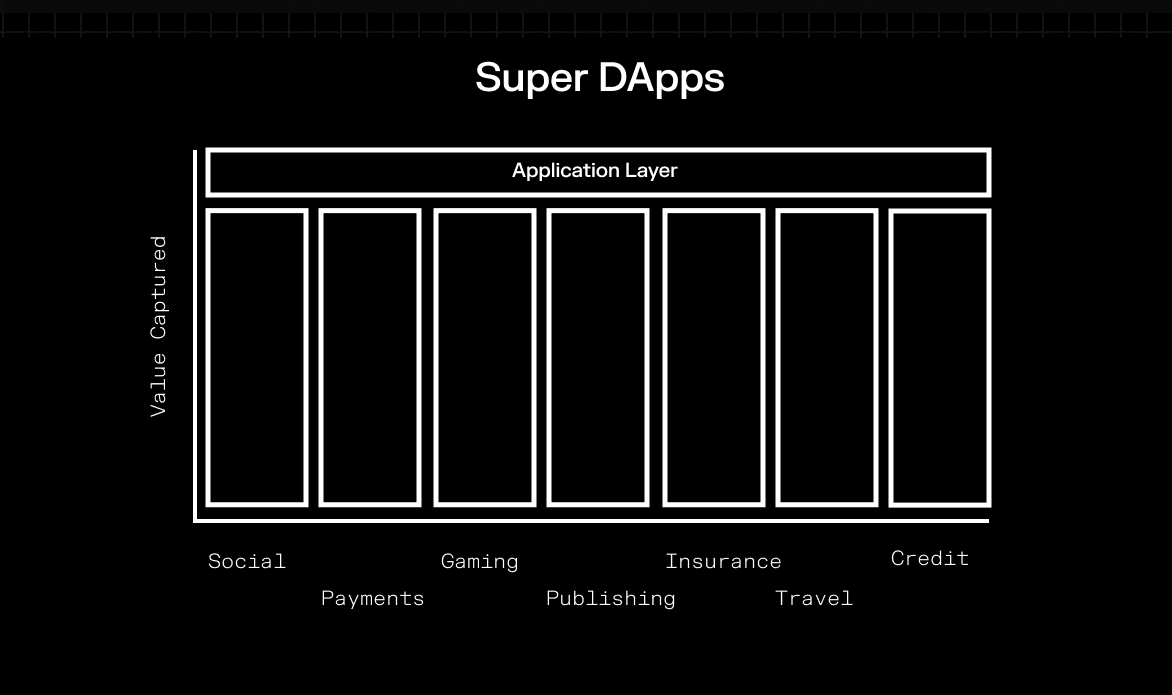 Crypto investors have put this thesis to practice over the last 4 years, investing heavily in layer 1 and infrastructure projects. It's possible that value concentrates at the shared protocol layer for a specific industry or use-case, but it may also be true that one application wins the 'application layer' race, applying the features of these open protocols into an all-in-one user experience across many verticals. Like WeChat but with decentralized infrastructure. This super dapp may not own the rails it's built on, but it'll own the consumer, which some may argue is more lucrative. In fact, the consumer will also be the employee in certain cases. Since one dapp will be able to provide users with a majority of the features they use in their daily lives, the 'application layer' race will be winner-take-all; one or very few super DApps will become incredibly valuable.