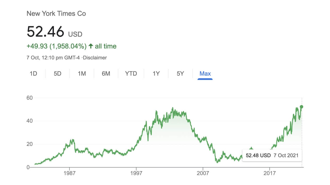 To understand my point, you don't actually need to know the story of the NYT's transition from print, to digital advertising, to digital subscription. What matters is that digital subscriptions are now their biggest revenue stream, and that the transition to those subscriptions and to the digital world has been a difficult but seemingly successful one (as illustrated by their stock price).