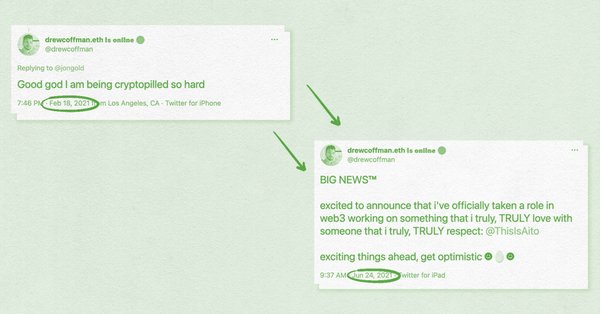 "There's never been a better time to quit your job and work in Web3" - Mason Nystrom "I dropped out of school, quit my job, and moved to a new city to go all in crypto and it was the best decision i've ever made. The younger me would be proud." - Carter "I just quit the Apple Design Team to work on crypto full time..." - Dorian Dargan