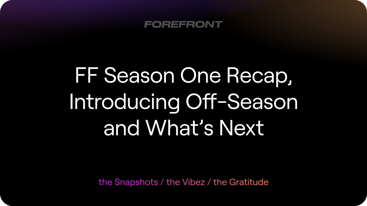 Forefront Season One is coming to a close. With that, the Off-Season will begin as a time of reflection, recovery, and reimagination of the Forefront DAO. We’ll still be shipping, but with a renewed focus on making sure we’re prepared to make Season 2 the best DAO experience ever.
