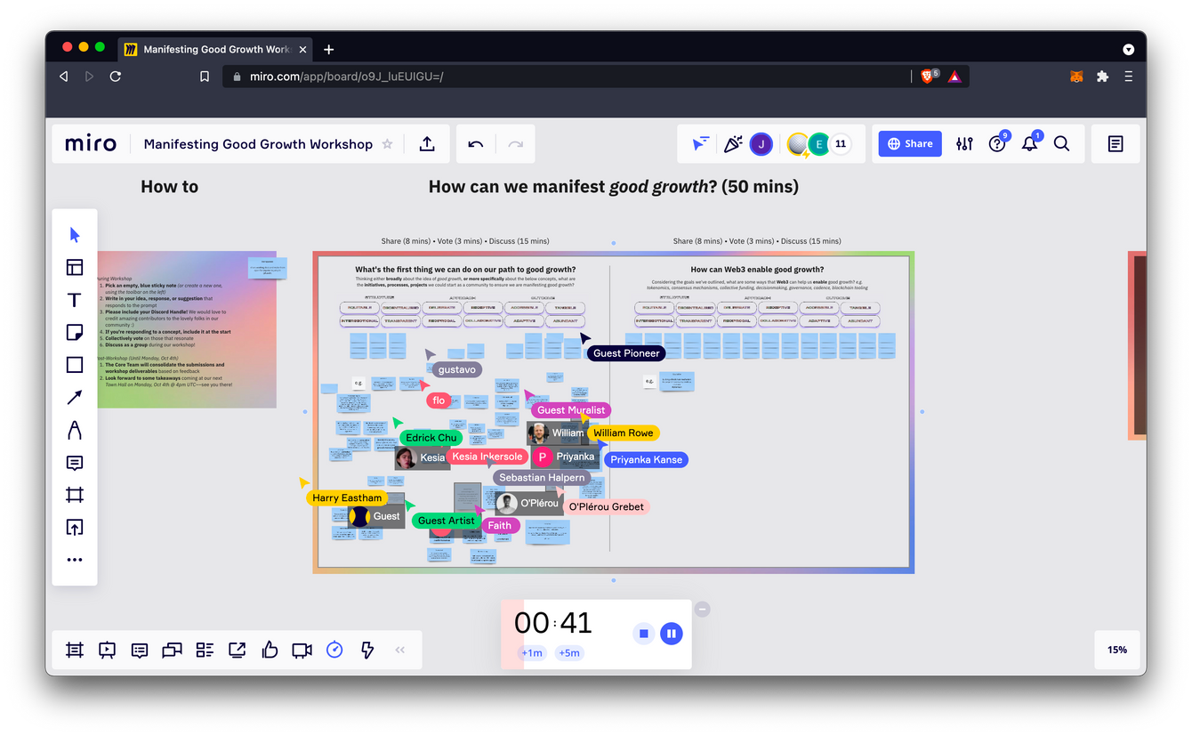 We're seeing this in the hive mind of PHLOTE, where people are solving UX and logo design problems. It's cropping up in the Discord stages everyday, where over 100 people in the community are collaboratively working together using tools like Miro, Figma, Googlesheets. And we're putting it into practice at Protein Community with a series of workshops, progressively defining Good Growth through continuous collective refinement.