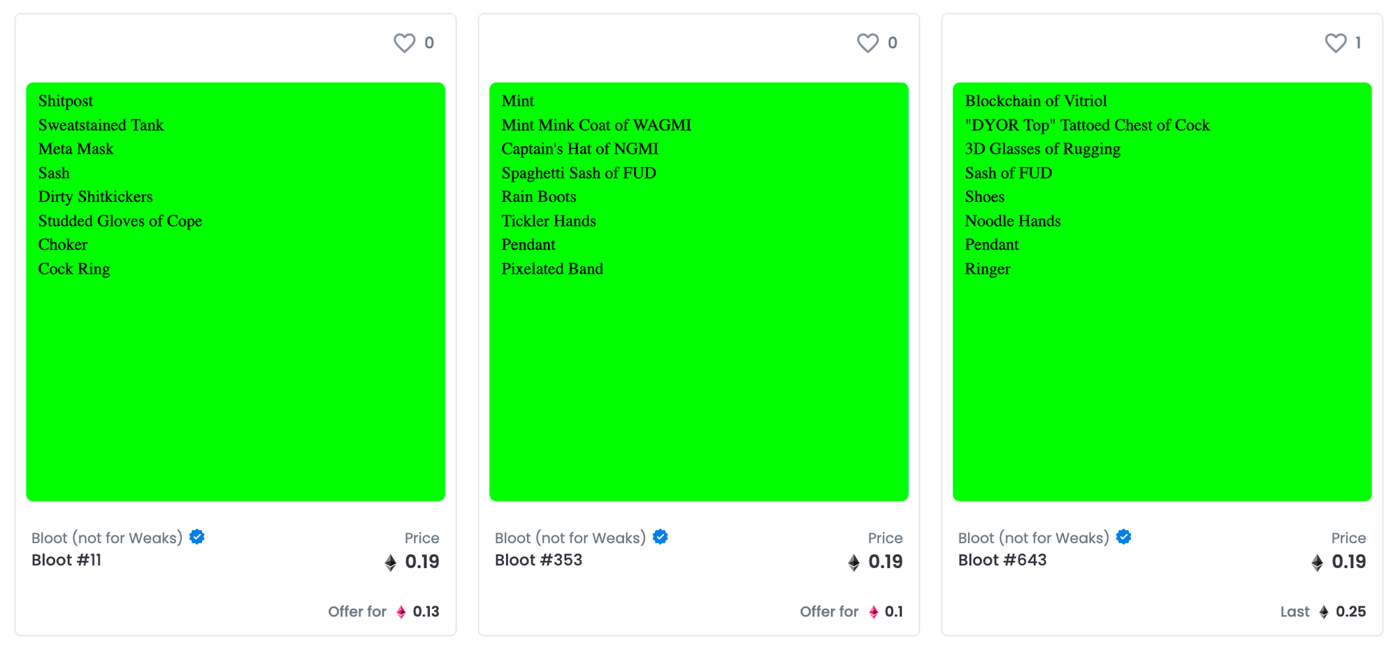 Then, in the flurry of expansion, variations on Loot started appearing: Loot for CryptoPunks, Treasure for Loot, and the infamous Bloot (not for weaks). Bloot quickly took hold as an alternative to Loot, with 'armour' like 'silver nipple rings of gains' 'shitty shoes' and 'ball gags'.