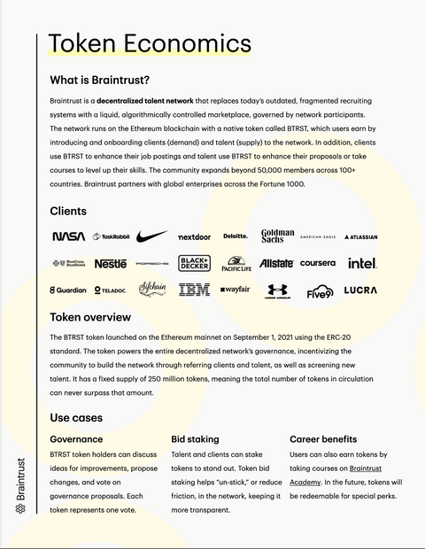 Going forward, members are able to initiate proposals and vote on important topics, including determining the commission fees that Braintrust should take in. They're ideating on new token perks (insurance for freelancers anyone?!). And the token's already been developing some new market mechanics----clients are able to buy $BTRST as a way to prioritize their job listings and cut through the noise.
